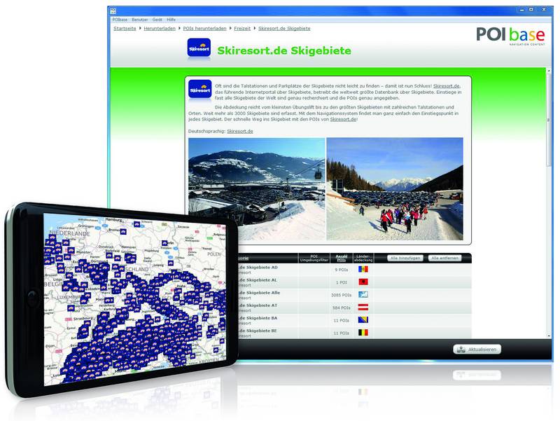 Skiresort.ch, das weltweit größte Skiportal, nutzt die Software POIbase um Skifahrern und Snowboardern die gewünschten Skigebiete und viele aktuelle Zusatzinfos jetzt auch auf das Navigationssystem zu übertragen.