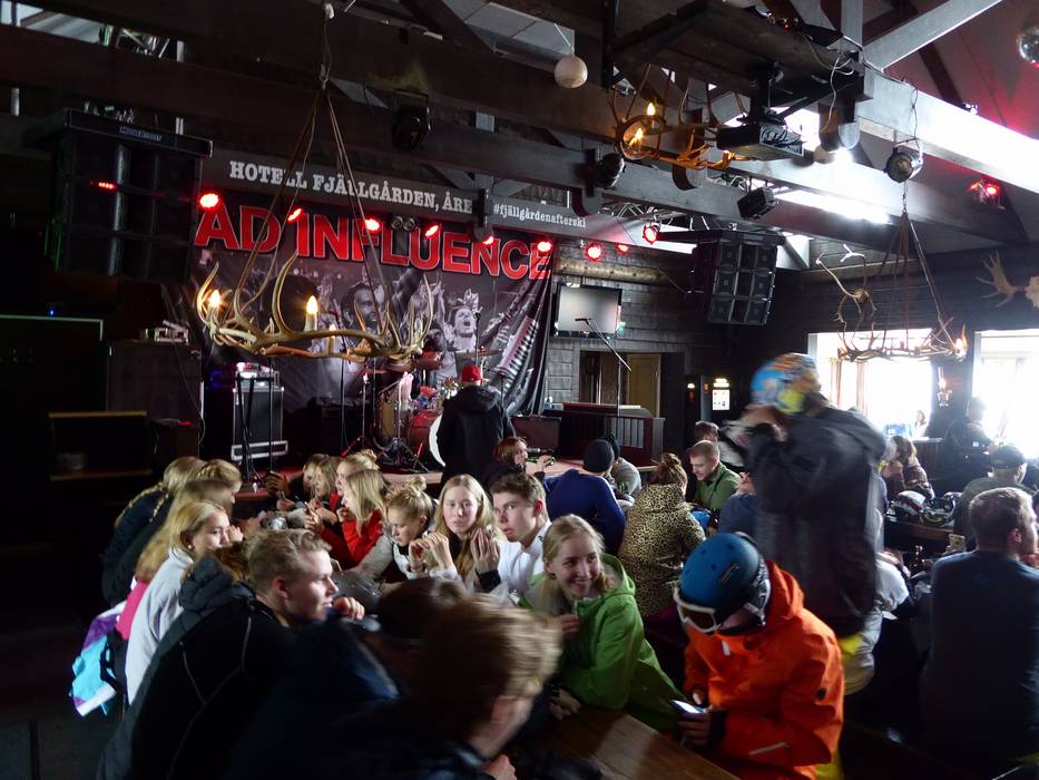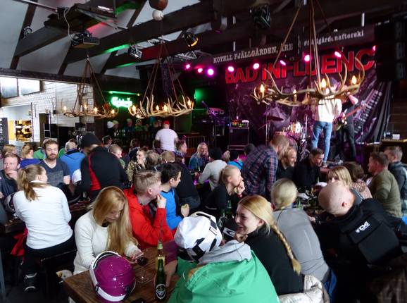 Am frühen Nachmittag startet man hier bereits mit dem Après-Ski. Ein Highlight sind die Auftritte von verschiedenen Bands. Die Stimmung ist ausgelassen und man feiert gut. Danach geht es mit den Skiern oder mit der Bergbanan hinunter nach Åre.
