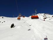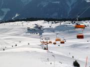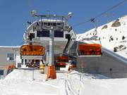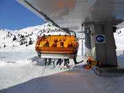 Die 4er-Sesselbahn Bettmeralp-Blausee hat eine Mittelstation. Die Liftanlage ist mit kindersicheren Sicherheitsbügeln sowie orangefarbenen Wetterschutzhauben ausgestattet.