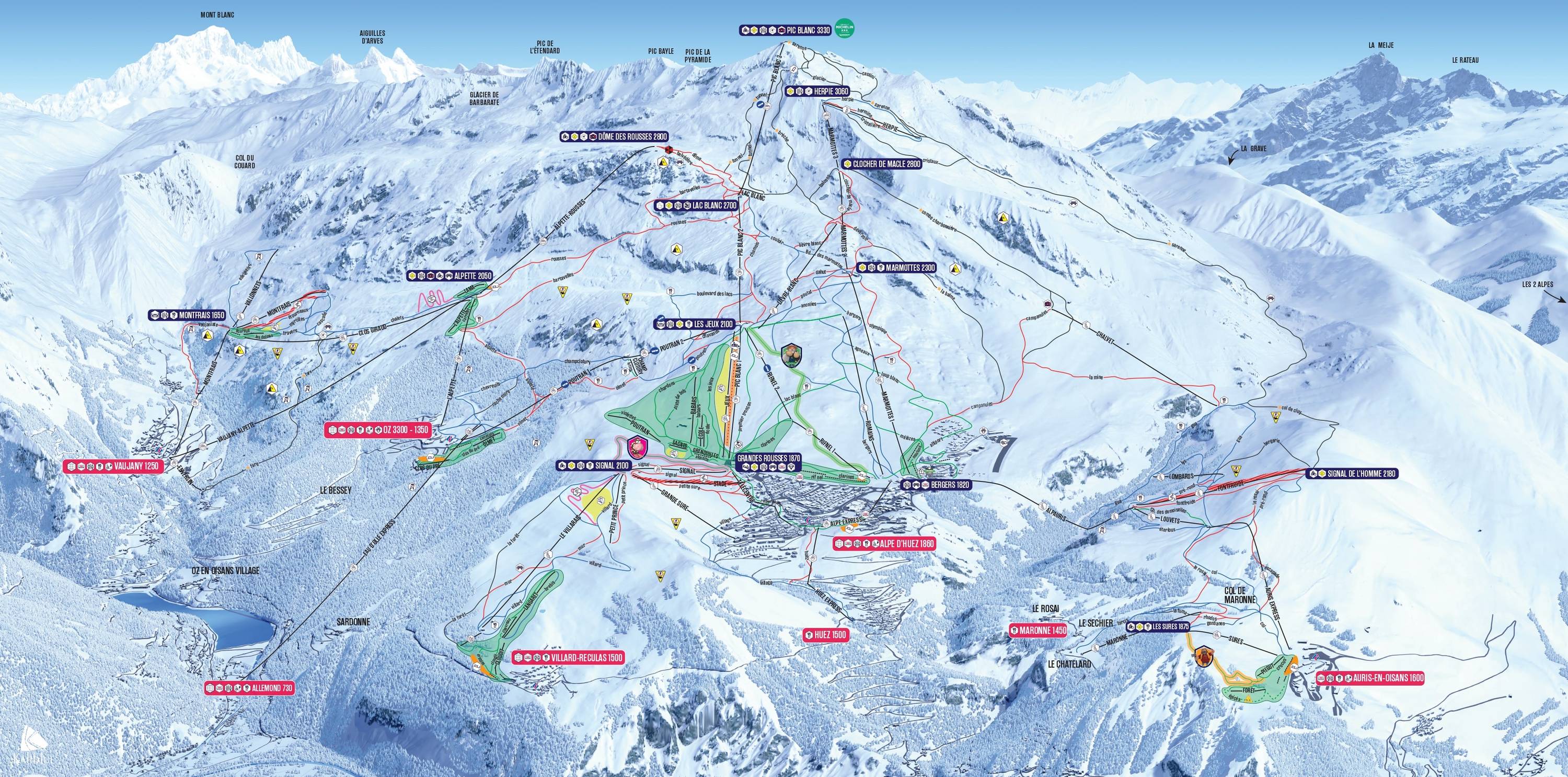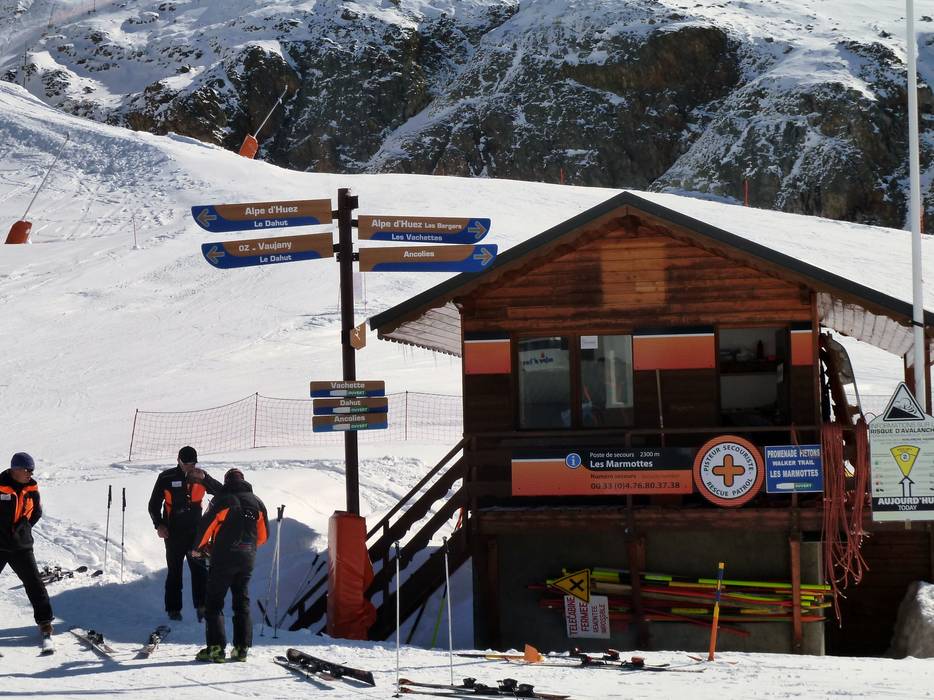 Orientierung (Pistenplan, Informationstafeln, Ausschilderung) und Sicherheit im Skigebiet Alpe d'Huez