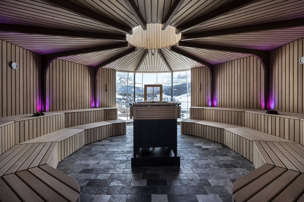 Im 25 Meter langen, ganzjährig beheizten Sky Pool lässt es sich bei angenehmen Temperaturen an der frischen Luft Bahnen ziehen oder im Whirlpool relaxen. Der Wellnessbereich, der mit etwa 5.000 m² zu den größten der Dolomiten zählt, bietet wohltuende Erholung von der Alltagsroutine. Das absolute Highlight ist die rotierende Event-Sauna mit 360°-Ausblick auf die Dolomiten.