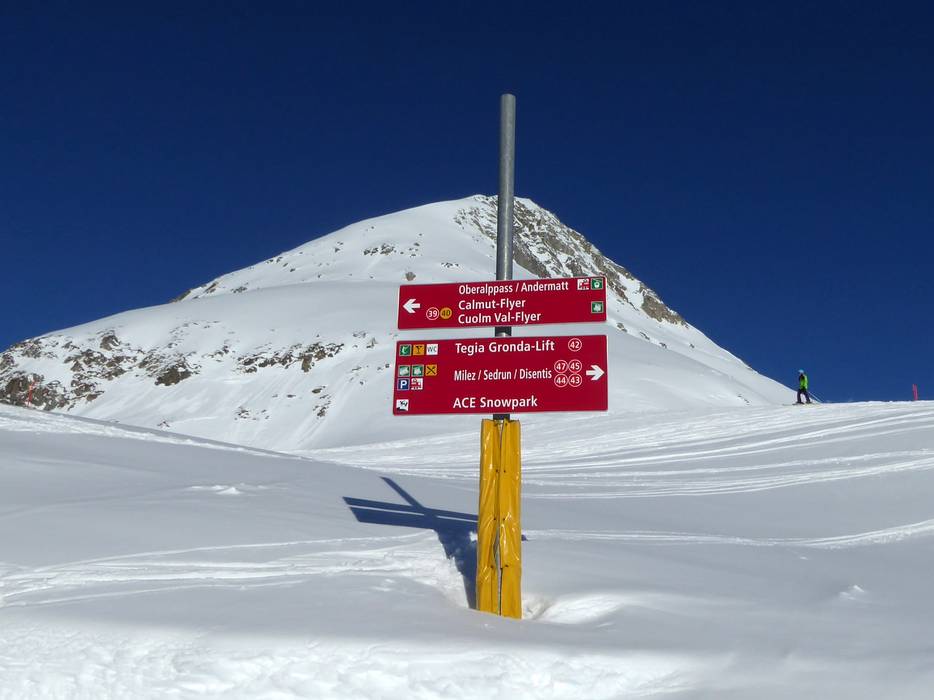 Orientierung (Pistenplan, Informationstafeln, Ausschilderung) und Sicherheit im Skigebiet Andermatt/Oberalp/Sedrun