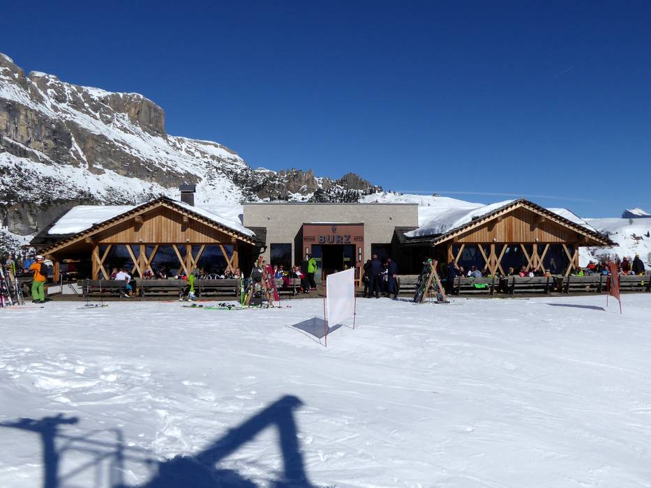 Die Berghütte Burz vereint Tradition mit Modernität. Man kann sich innen am Kamin wärmen, durch die großen Fenster das Panorama genießen oder sich gleich auf die Terrasse setzen. Man wird mit traditionellen, ladinischen Spezialitäten und Pizzen verwöhnt.