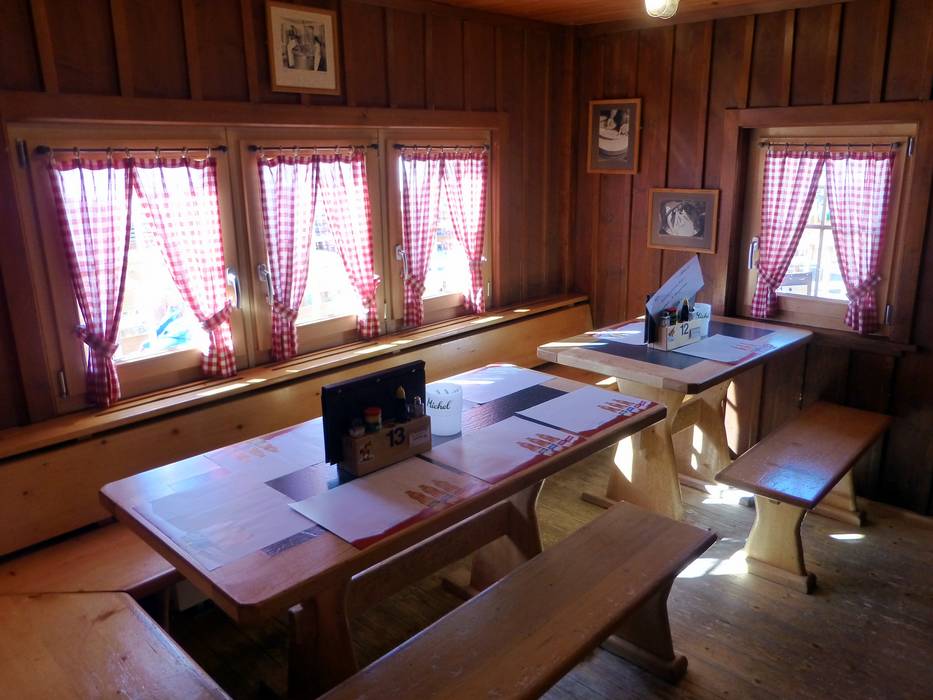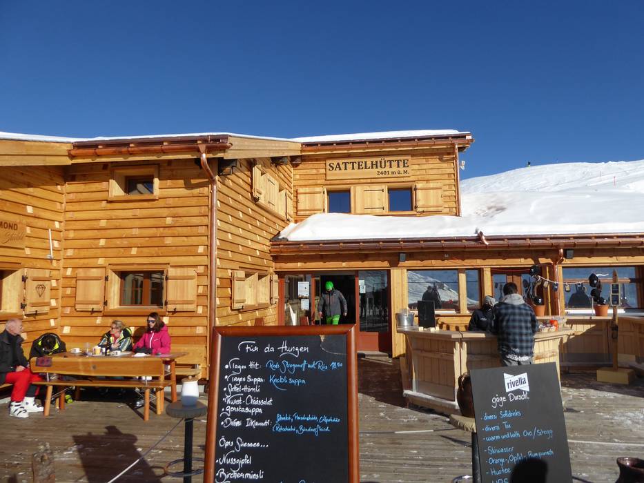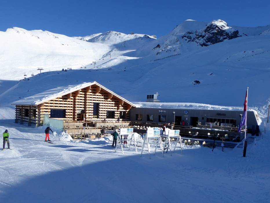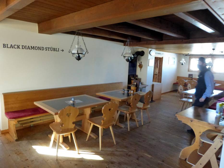 Die typische Schweizer Hütte bietet hausgemachte Speisen und einen traumhaften Blick mit großer Sonnenterrasse. An kalten Tagen wartet das urige Black Diamond Stübli.