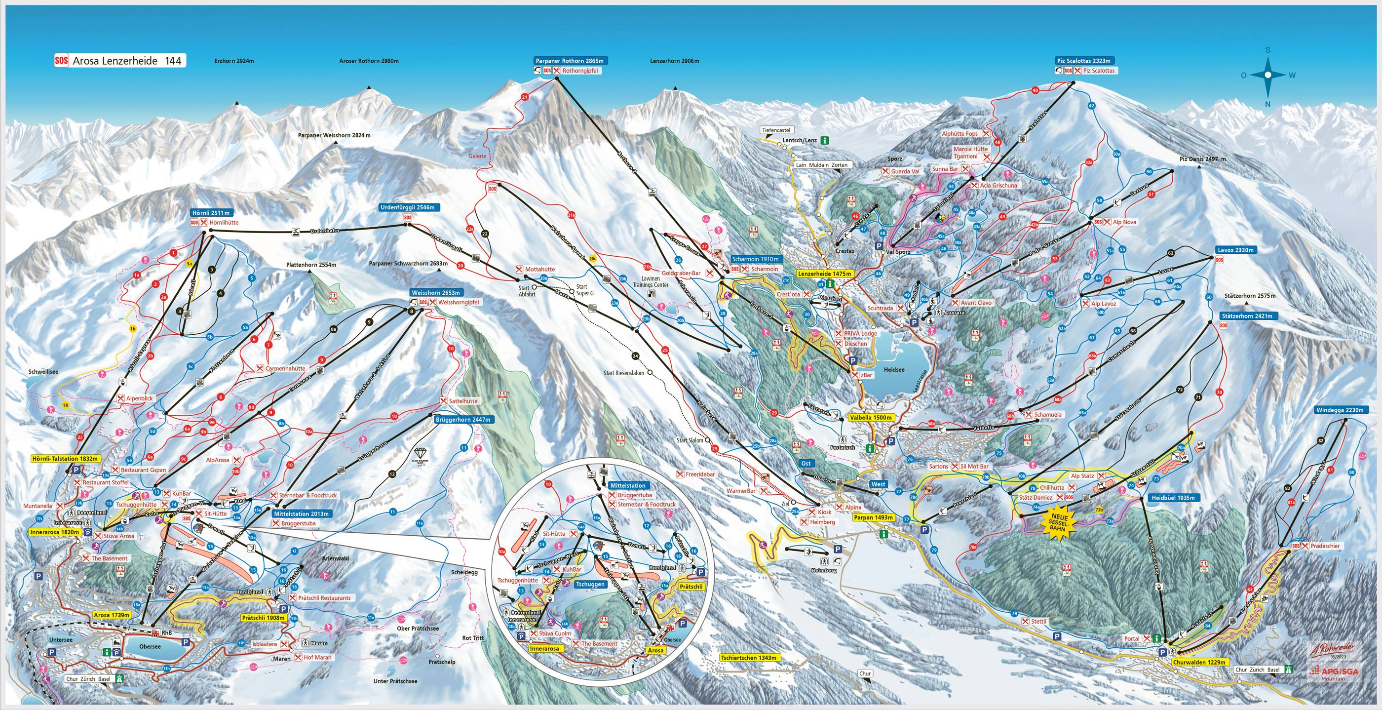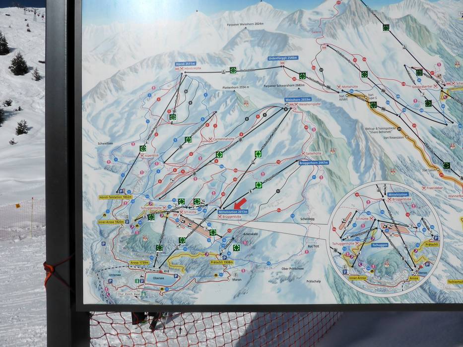 Der Pistenplan ist sehr übersichtlich. Ein Teil von Arosa, der sonst sehr klein dargestellt wäre, ist noch extra herausgearbeitet. Die Legende erklärt alles gut und die Rückseite bietet Informationen zu den Einkehrmöglichkeiten.