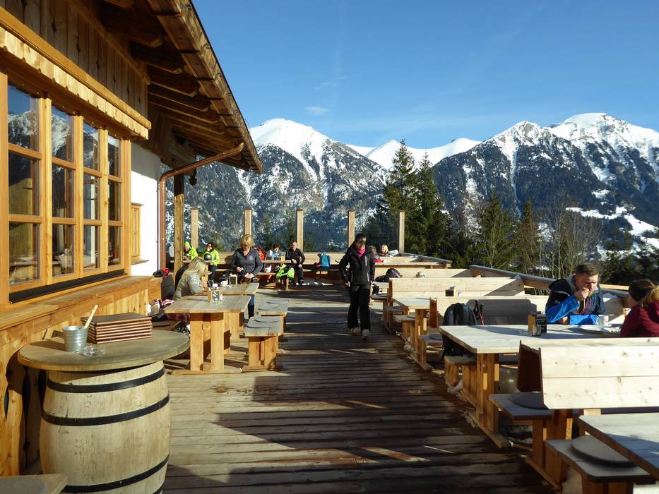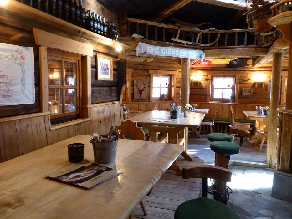 Die rustikale Hütte bietet leckeres Essen und gute Weine. Von der großen Sonnenterrasse hat man einen herrlichen Blick ins Angertal.