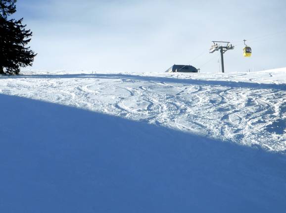 Die steilste Abfahrt des Skigebiets, der Slalomhang, verläuft entlang der Gondelbahn und mündet in der Donauwellenabfahrt.