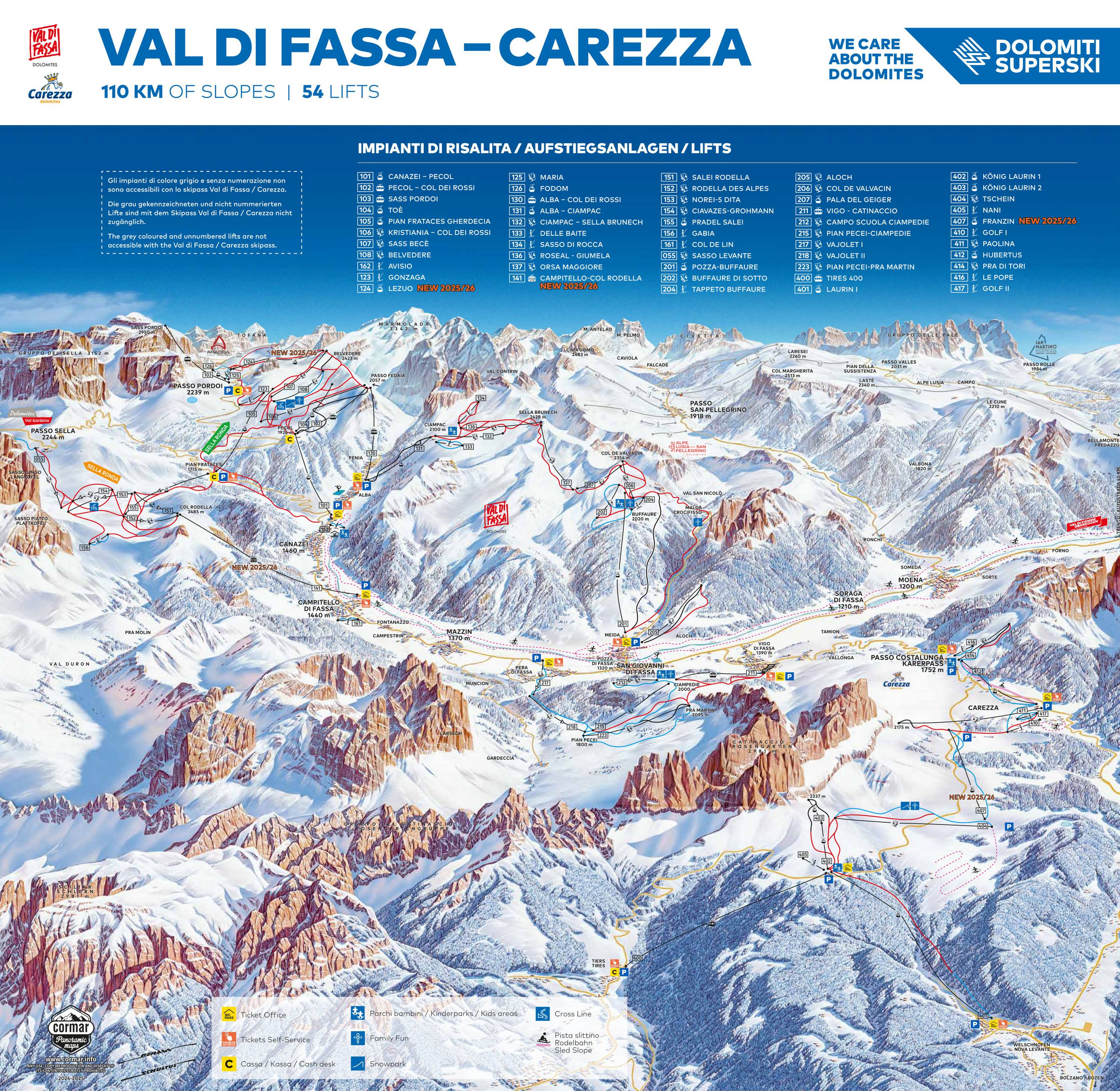 Der Pistenplan stellt das Skigebiet detailliert dar. Es sind alle Lifte und Pisten im Detail eingezeichnet. Zusätzlich gibt es noch einen Pistenplan von Dolomiti Superski.
