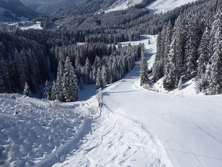 Steile Piste unterhalb der Panoramabahn Rastkopf, die im unteren Teil in eine mittelschwere Piste übergeht.