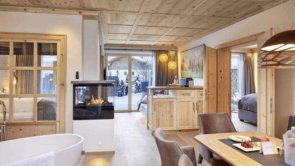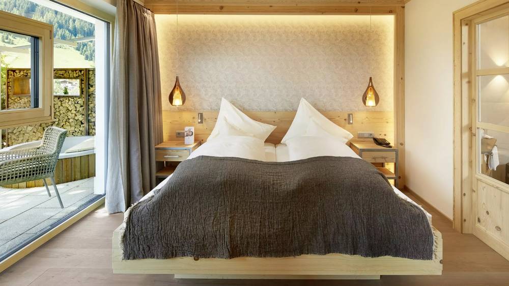 Die Zimmer und Suiten sind sehr gemütlich-modern und luxuriös eingerichtet, mit Balkon und herrlichem Bergpanorama. Von den Zimmern und Suiten sieht man den Sonnenuntergang am Hönig und Roten Stein und man fühlt sich wie in einer anderen Welt. Es duftet nach Zirbe und man fühlt sich rundherum wohl. Hochwertige Pflegeartikel und ein 2 x täglicher Zimmerservice runden das Angebot ab.