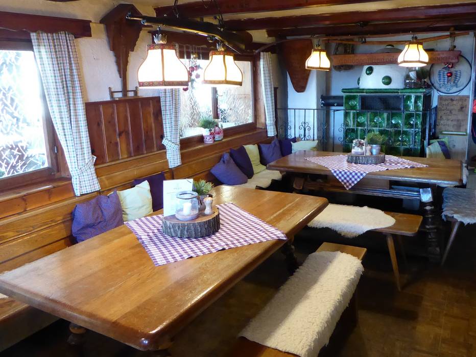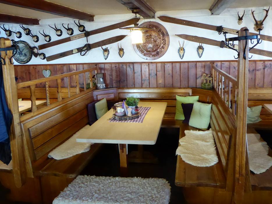Gemütliche Hütte mit Kachelofen und typischen bayerischen Gerichten. Bei Sonnenschein lockt die Sonnenterrasse.