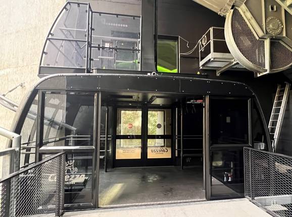Der namhafte Südtiroler Architekt Werner Tscholl hat die Tal- und Bergstation sanft in die faszinierende Landschaft unterm Rosengarten eingebettet. Die Stationen verschwinden unterirdisch in den Wiesen, sichtbar bleiben nur die Ein- und Ausgänge. Die Bergstation befindet sich bei der Frommer Alm.
