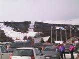 Eine nicht-geteerte Straße führt hinauf ins Skigbiet. Nur 5 km von der Hauptstraße aber leider steht man beim Umziehen im Matsch.