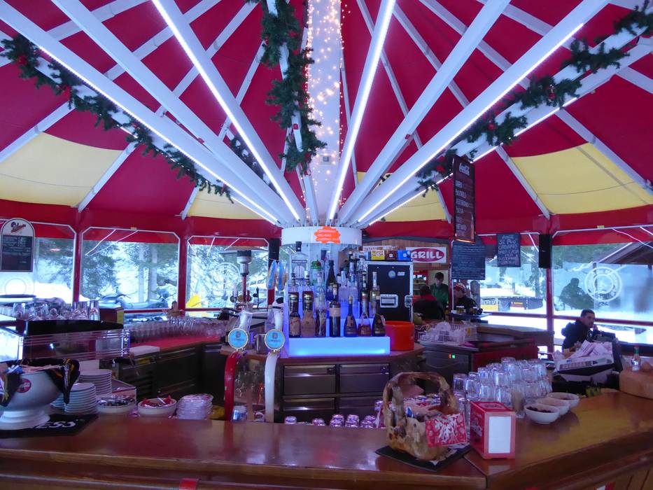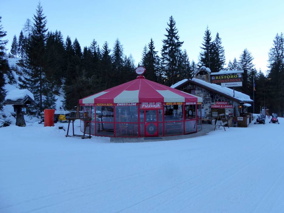 Die einzige richtige Schirmbar im Skigebiet von Civetta befindet sich direkt an der Piste Coldai. Hier kann man zum Après-Ski übergehen. Kurz vor 16.30 Uhr muss man aber dann los, denn man benötigt noch einen Lift, um die Talabfahrt zu erreichen.