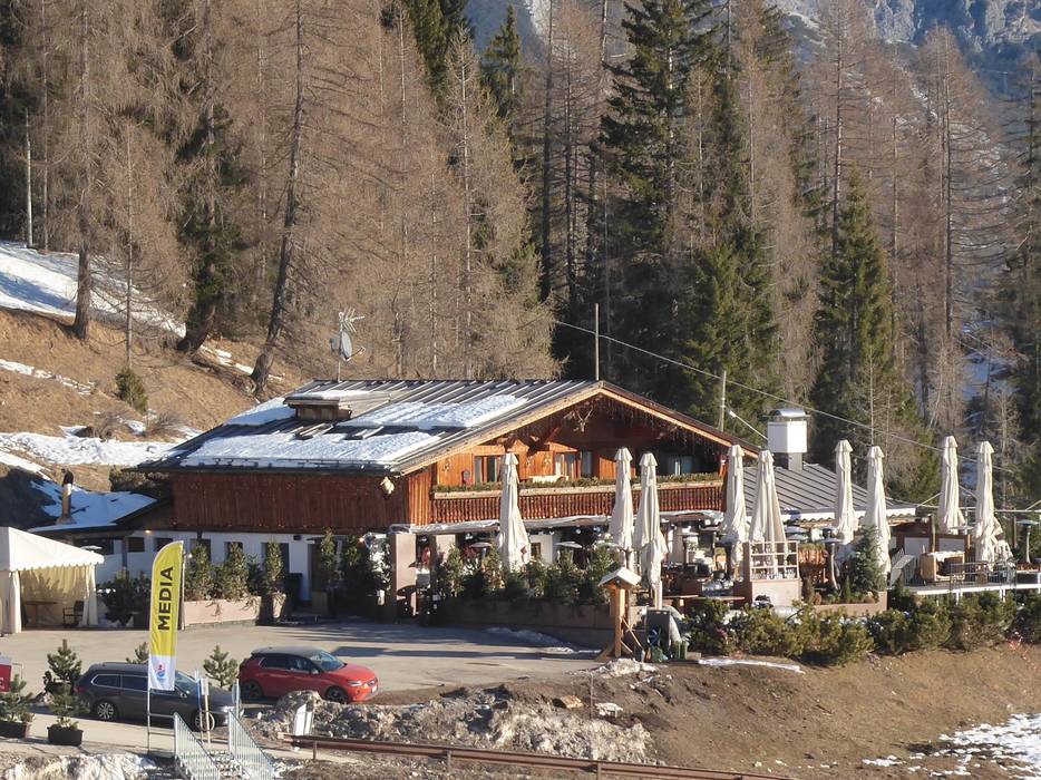 Am Start der Olympiapiste bietet die Hütte typische regionale Spezialitäten und eine große Sonnenterrasse. Der herrliche Blick auf die Dolomiten ist inklusive.