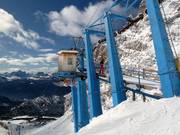 Im Sommer werden Gondeln an das Seil der 2er-Sesselbahn Valgrande - Forcella-Staunies fix geklemmt.