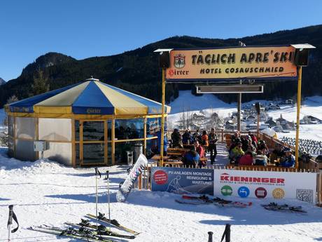 Im gesamten Skigebiet und an den Talstationen sind Schirmbars verteilt. Highlight ist das Go-Gosau am Hornspitz. Unter der Woche ist es eher ruhiger, aber am Wochenende kann es richtig zur Sache gehen. In der Skiregion Dachstein West wird es beim Après-Ski nicht langweilig.