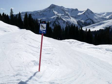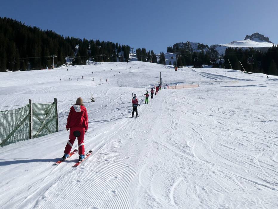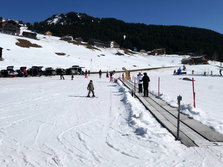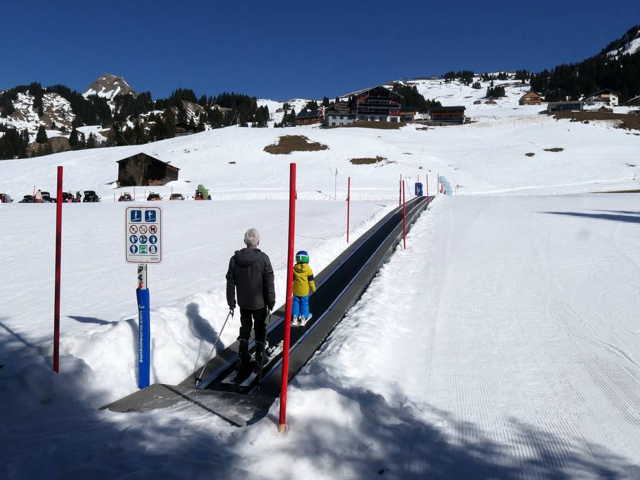 In der Nähe der Talstation der Sunneggbahn befindet sich ein großes Übungsgelände mit mehreren Zauberteppichen. Eines davon ist überdacht. Hier gibt es viel Platz und lustige Figuren für die Kleinen. Am Übungslift Sunnegg kann man sich dann gut steigern.