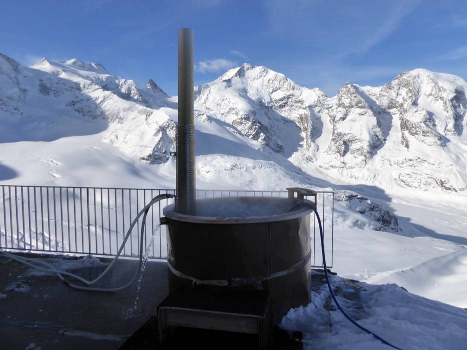 Abends, wenn die Skifahrer die Pisten verlassen haben, kehrt hier oben Ruhe ein. Eine einzigartige Bergkulisse schafft eine einmalige Abendstimmung. Komfortable Doppel-, Zweier- oder Viererzimmer sowie Gruppenunterkünfte werden angeboten. Highlight ist der Jacuzzi im Freien mit Blick auf das Berninamassiv und den Piz Palü.