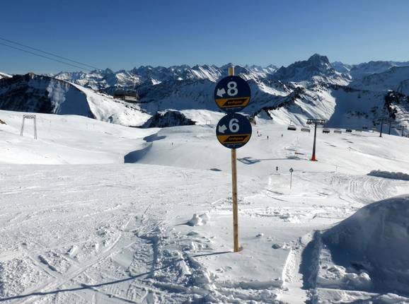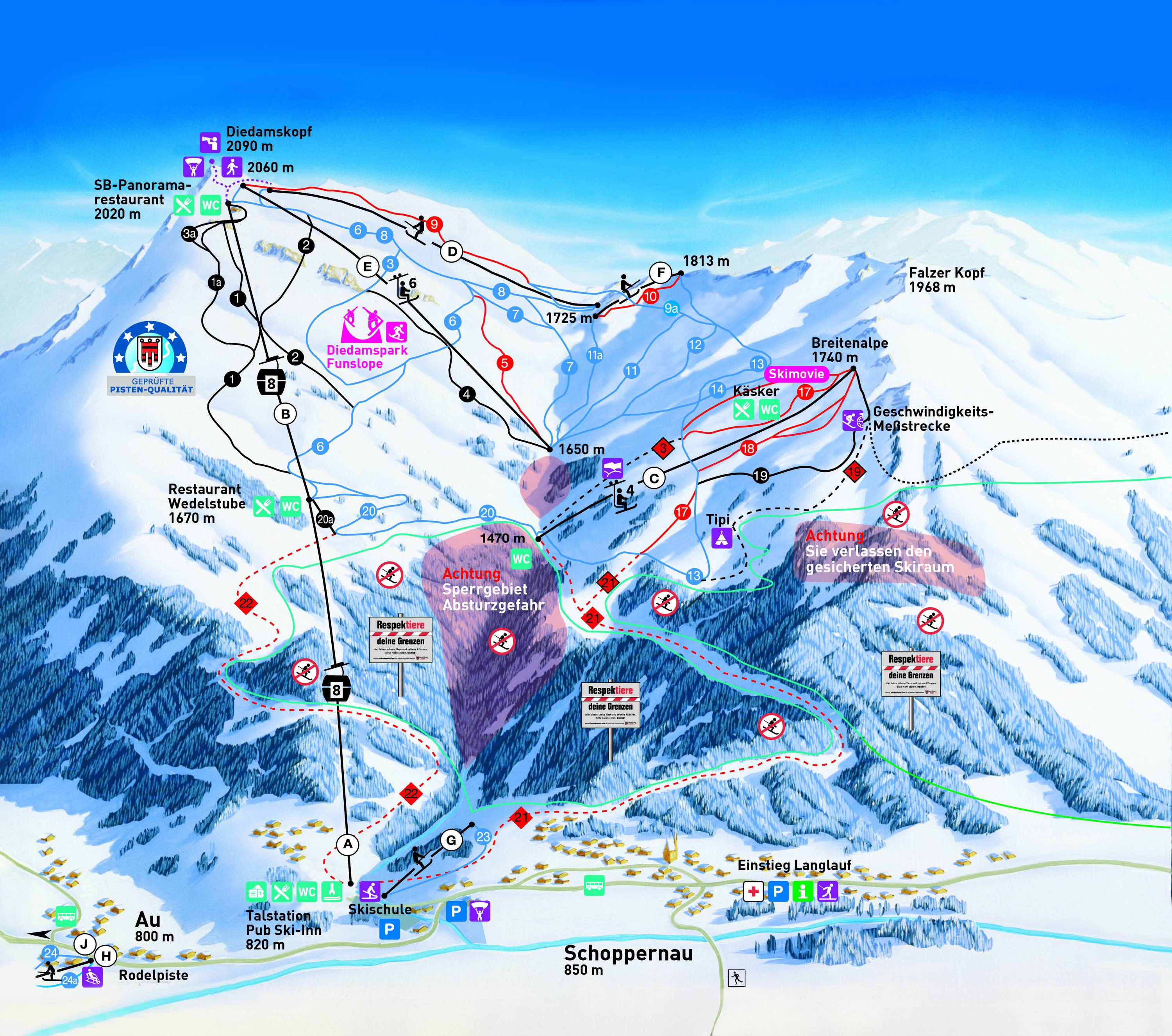 Orientierung (Pistenplan, Informationstafeln, Ausschilderung) und Sicherheit im Skigebiet Diedamskopf – Schoppernau
