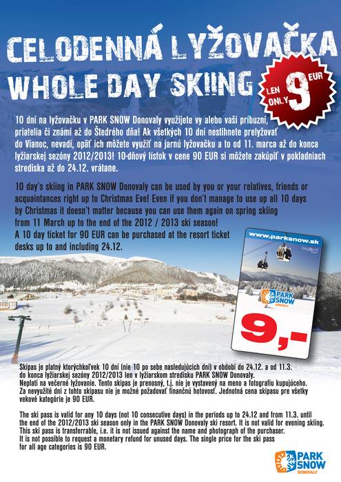 Unser 10-Tagesskipass nutzen Sie, Ihre Verwandten oder Freunde bis zum 24. Dezember. Auch nach diesem Termin können Sie den Skipass ab 11. März wiederverwenden und die übrigen Tage auf den Skihängen genießen.Der 10-Tagesskipass können Sie für 90 € an allen unseren Kassen bis zum 24. Dezember kaufen.Der Skipass ist übertragbar und gilt:• als Wahlabo-Skipass ( 10 beliebigen Tagen) in der Zeitabschnitten von Anfang der Saison bis zum 24.12. und wieder ab 11.3. bis zum Ende der Wintersaison.