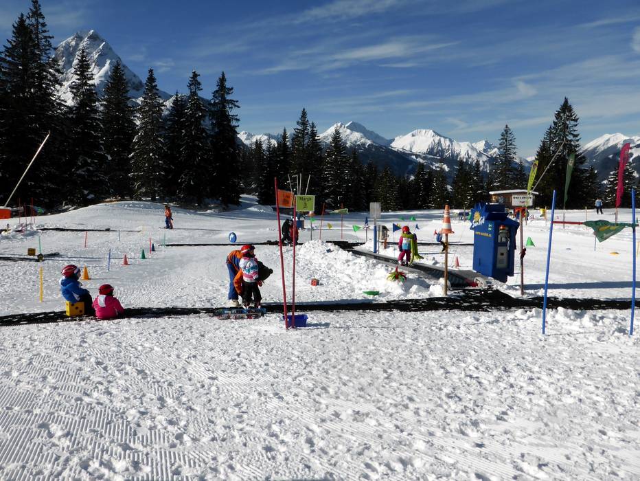Eigener Bereich mit Seillift auf der Ehrwalder Alm. Hier können die Eltern mit der Gondelbahn auch als Nichtskifahrer auf den Berg und ihren Kleinen bei den ersten Schwüngen zuschauen.