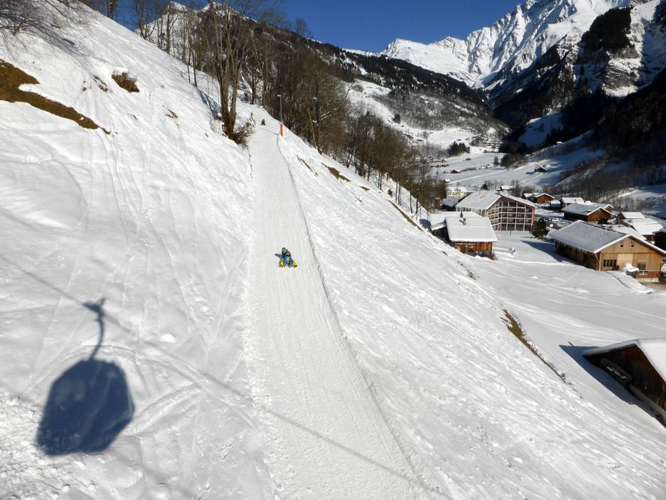 Die Rodelbahn startet an der Bergstation der Gondelbahn Elm-Ämpächli und endet direkt an der Talstation. Optimal für Wiederholungsfahrten.