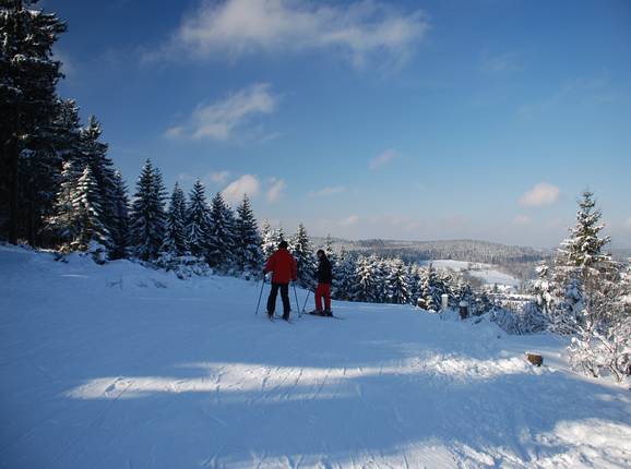 Der rechte Skilift bedient den leichten (aber für absolute Anfänger doch nicht ganz geeigneten) und breiten Haupthang. Der linke Lift führt ein Stück höher und erschließt zusätzlich zwei kurze, aber steilere Strecken sowie einen gemütlichen Skiweg durch den Wald. Für Neulinge gibt es einen Übungshang am Förderband. Alle Pisten sind beleuchtet.