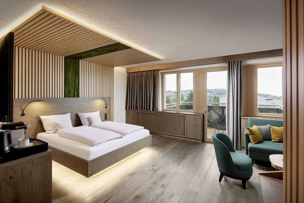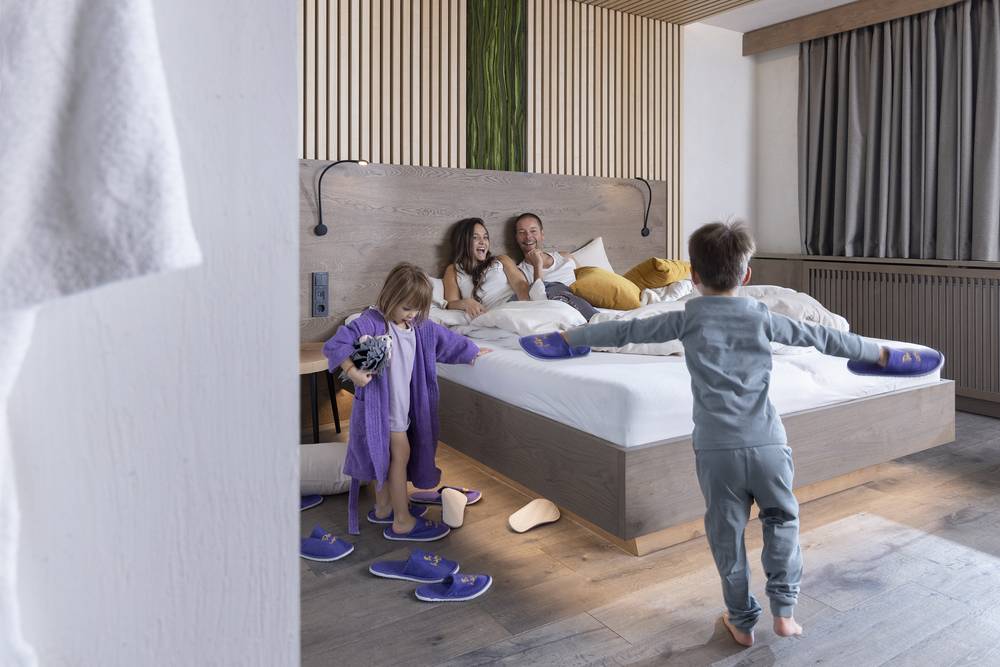 Nach einer sehr netten Begrüßung des Personals an der Rezeption wird man auf sein Zimmer begleitet. Die luxuriösen Familiensuiten mit eigenen Kinderzimmern sind sehr geschmackvoll gestaltet, sehr geräumig und man findet selbstverständlich alles, was für einen unbeschwerten Urlaub mit Kind oder Baby benötigt wird. Nichts muss von zu Hause mitgebracht werden! Die Ameise Lotte, Igel Iknazz und der Waldkauz Herrmann sind Paten der verschiedenen Stockwerke. Für jede Suite und für jedes Chalet sind kostenfreie Stellplätze in der Tiefgarage reserviert, und das Gepäck wird selbstverständlich ins Zimmer gebracht.
