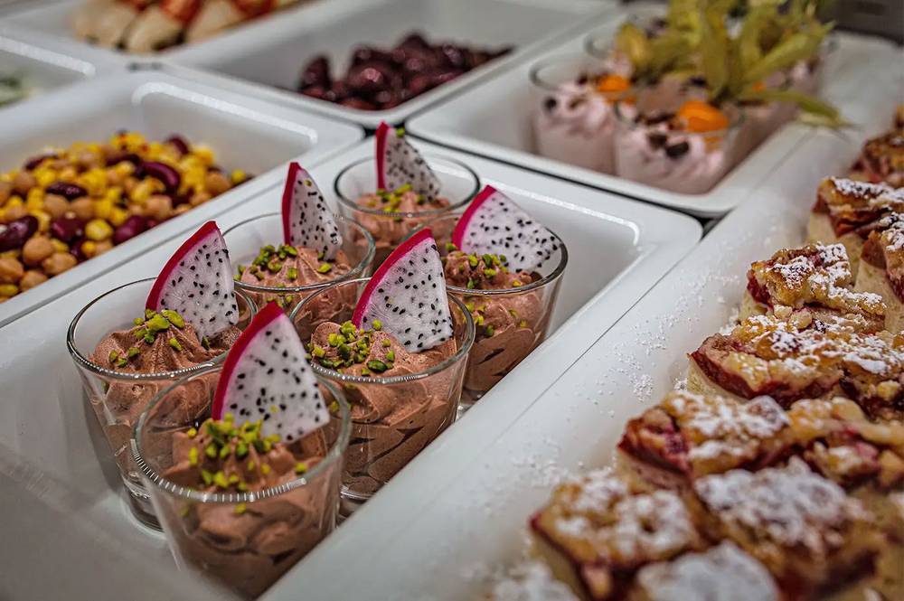 Morgens stärken sich die Hotelgäste an einem reichhaltigen Frühstücksbuffet mit Thüringer Spezialitäten und beliebten Frühstücksklassikern. Tagsüber bietet die Kaffeebar kostenfreie Kaffee-Spezialitäten. Am Abend verwöhnen die variantenreichen Menüs, in Verbindung mit einem Vorspeisen- & Dessertbuffet den Gaumen der Gäste.