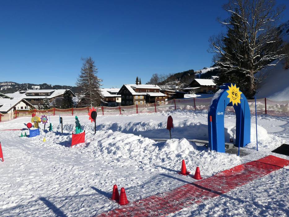 Das sehr schöne Kinderland der Skischule befindet sich am Ideallift in Riezlern. Mit Zauberteppichen und lustigen Figuren sind Kinder hier ideal aufgehoben.