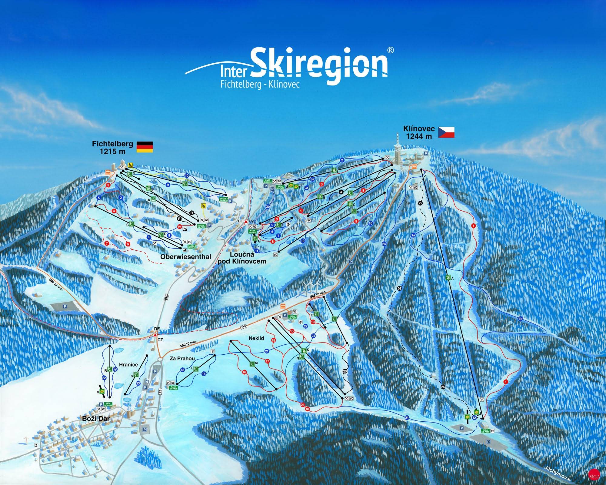 Der Pistenplan bildet das Skigebiet gut ab. Es sind alle Pisten und Lifte mit Detailinformationen beschrieben. Preise, FIS-Umweltregeln und das Skigebiet Klinovec/Keilberg sind auch eingezeichnet.