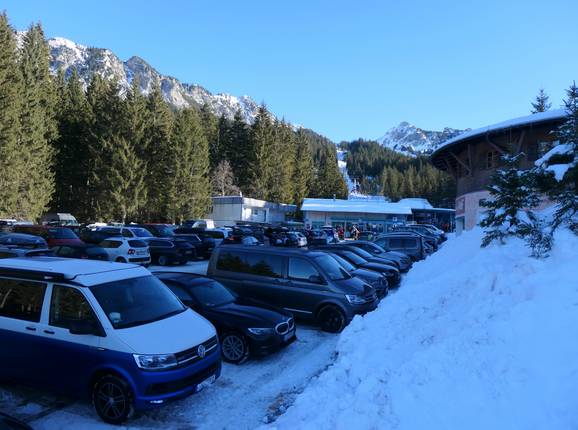 Das Tiroler Skigebiet Füssener Jöchle liegt am Ort Grän im Tannheimer Tal. Dieses erreicht man von Nord-Westen kommend vignettenfreie über die A7 Memmingen-Füssen, Anschlussstelle Oy-Mittelberg. Aus dem Raum München/Augsburg fährt man am günstigsten über die A96 und ab Kaufbeuren weiter via Landstraße über Pfronten. Der kostenpflichtige Hauptparkplatz befindet sich direkt an der Gondelbahn. Weitere kostenpflichtige Parkplätze liegen am Anfängerbereich Märchenwiese bzw. Schachenlifte.