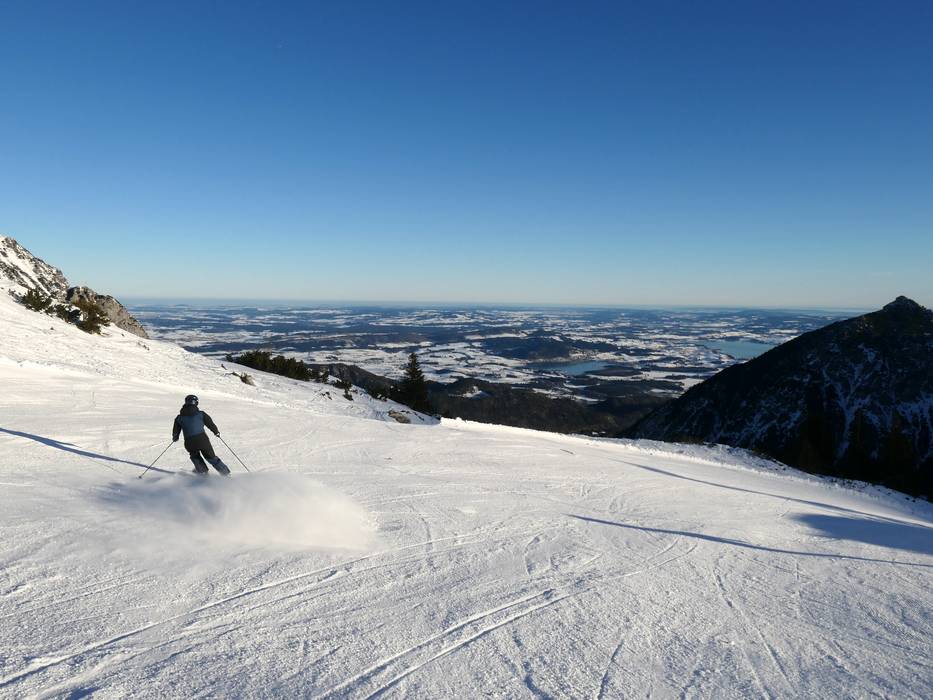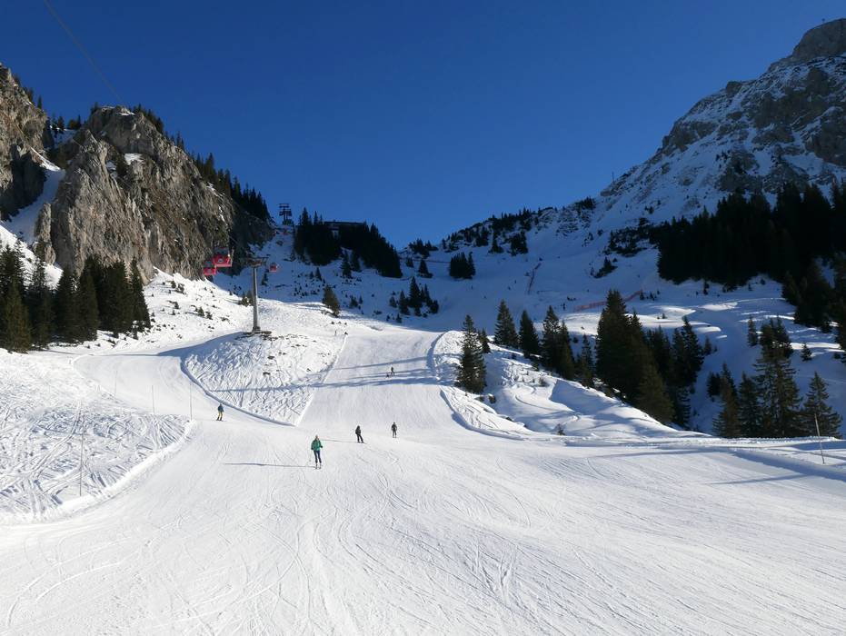 Die mittelschwere Talabfahrt führt vom Füssener Jöchle hinab. Nach unten wird sie flacher und schmäler.