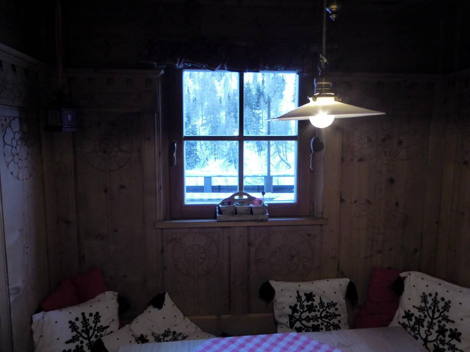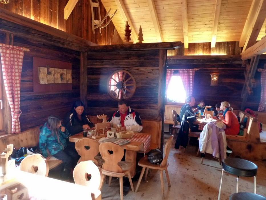 Kleine Skihütte mit schöner Aussicht auf der Sonnenterrasse. Typische regionale Gerichte stehen auf der Speisekarte.