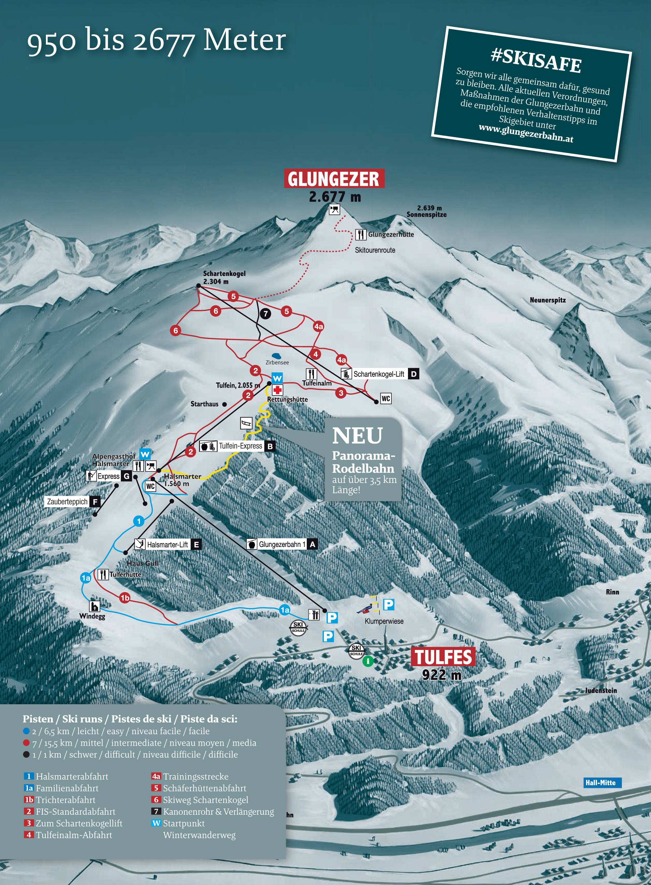 Der Pistenplan stellt das Skigebiet Glungezer gut dar. Die Bahnen, Pisten und Einkehrmöglichkeiten sind alle eingezeichnet und mit Namen versehen. Die Lifttypen sind ebenfalls vermerkt. Bei den wichtigsten Stationen ist die Höhe angegeben. Man könnte noch die Länge der Lifte und Pisten angeben.