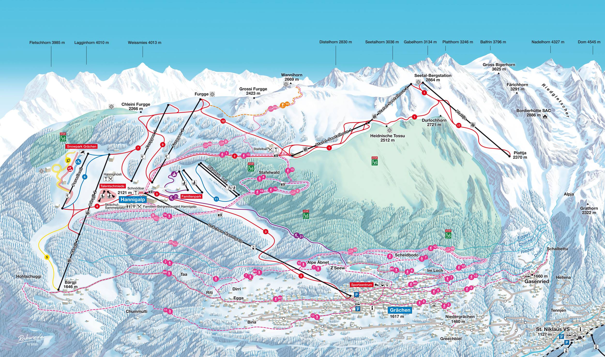 Orientierung (Pistenplan, Informationstafeln, Ausschilderung) und Sicherheit im Skigebiet Grächen