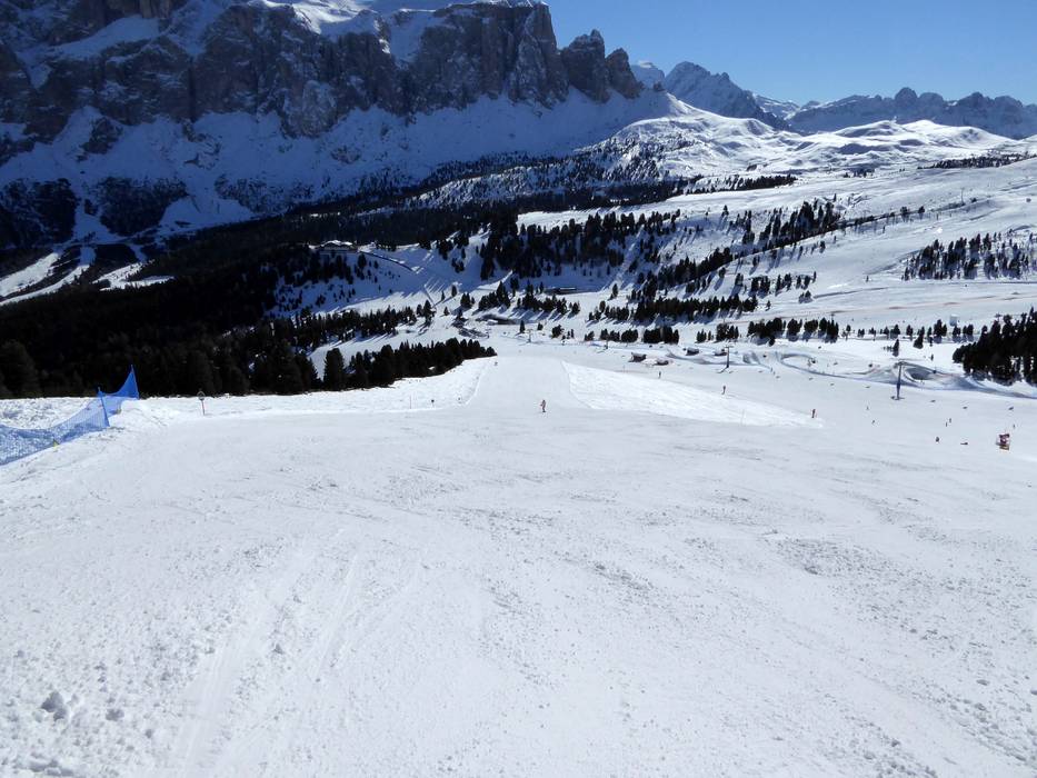 Eine der längsten Skipisten in den Dolomiten ist die 10,5 km lange „La Longia“, die vom Seceda 2518 m nach St. Ulrich 1.235 m hinunter führt.