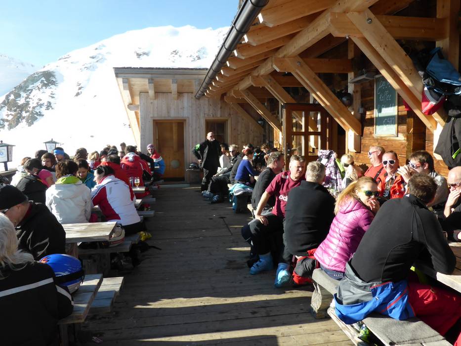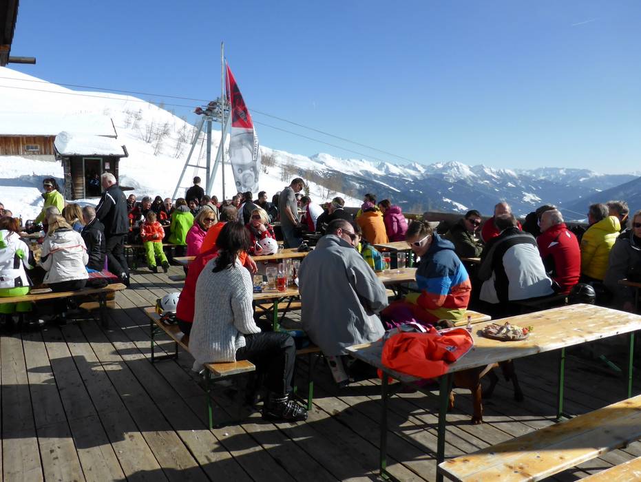 Bevor es ins Tal geht, kann man an sonnenverwöhnter Stelle in der Almrausch Hütte mit dem Après-Ski beginnen.