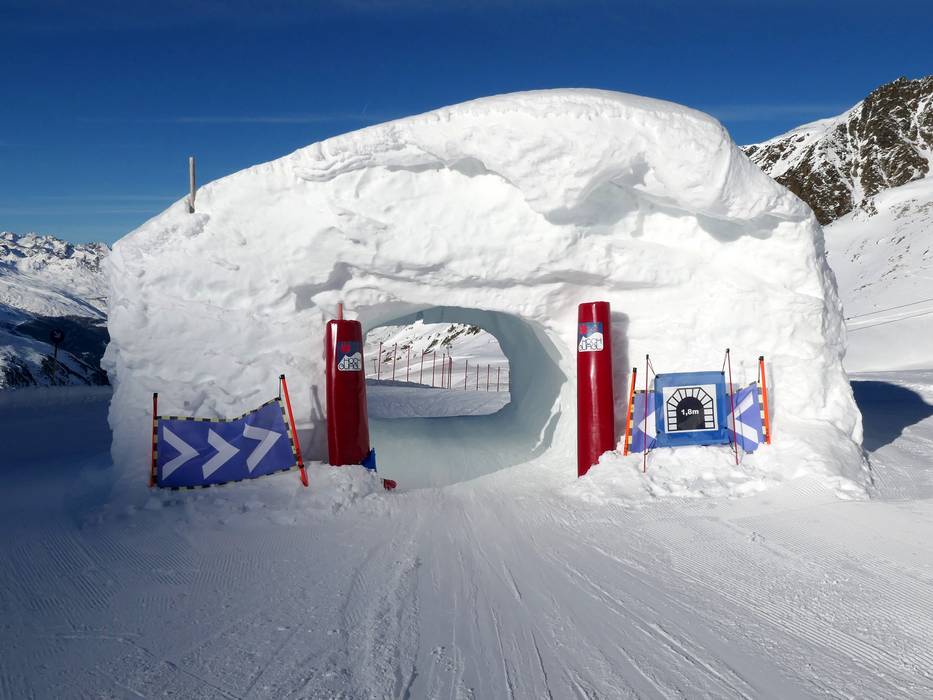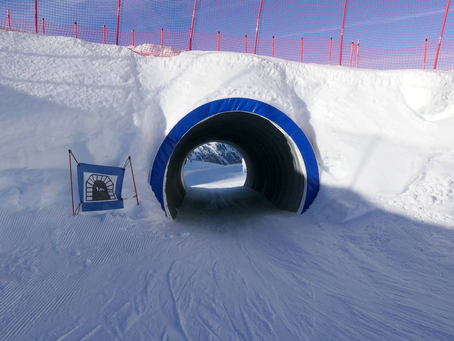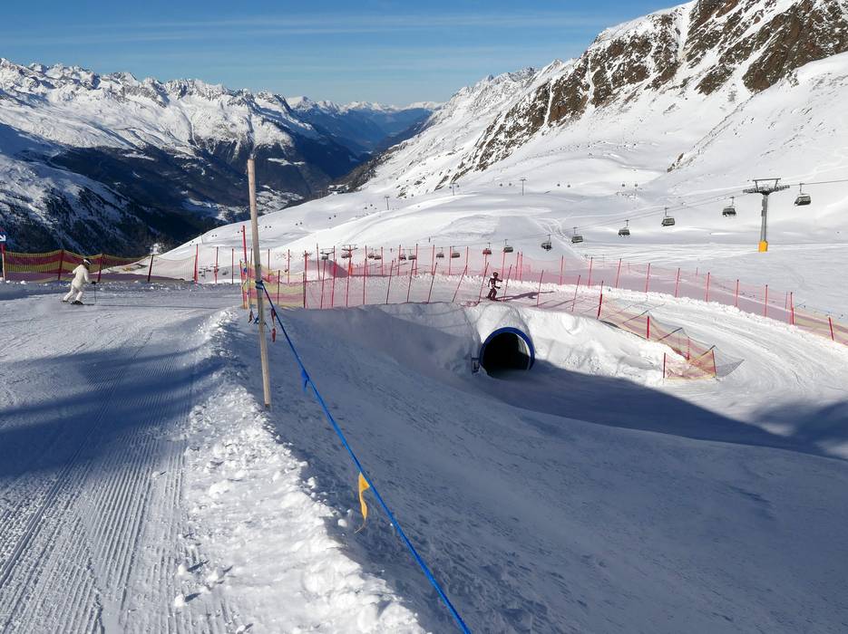 An einem überdachten Förderband in Hochgurgl können Kinder ideal die ersten Versuche auf Ski starten.