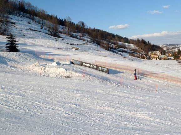 Es gibt einen ganz kleinen Snowpark mit einigen Obstacles neben der Talstation.