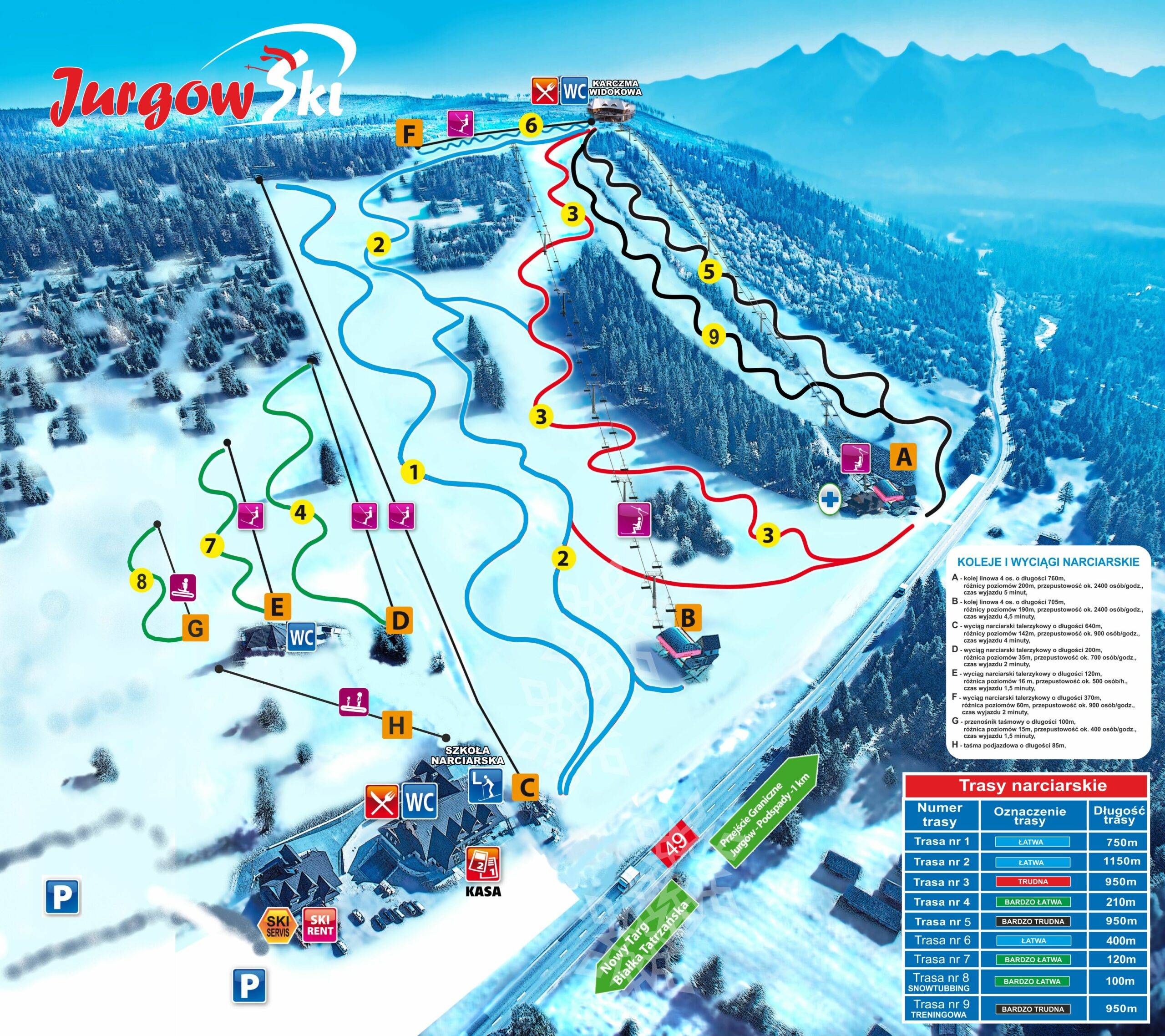 Orientierung (Pistenplan, Informationstafeln, Ausschilderung) und Sicherheit im Skigebiet Hawrań – Jurgów