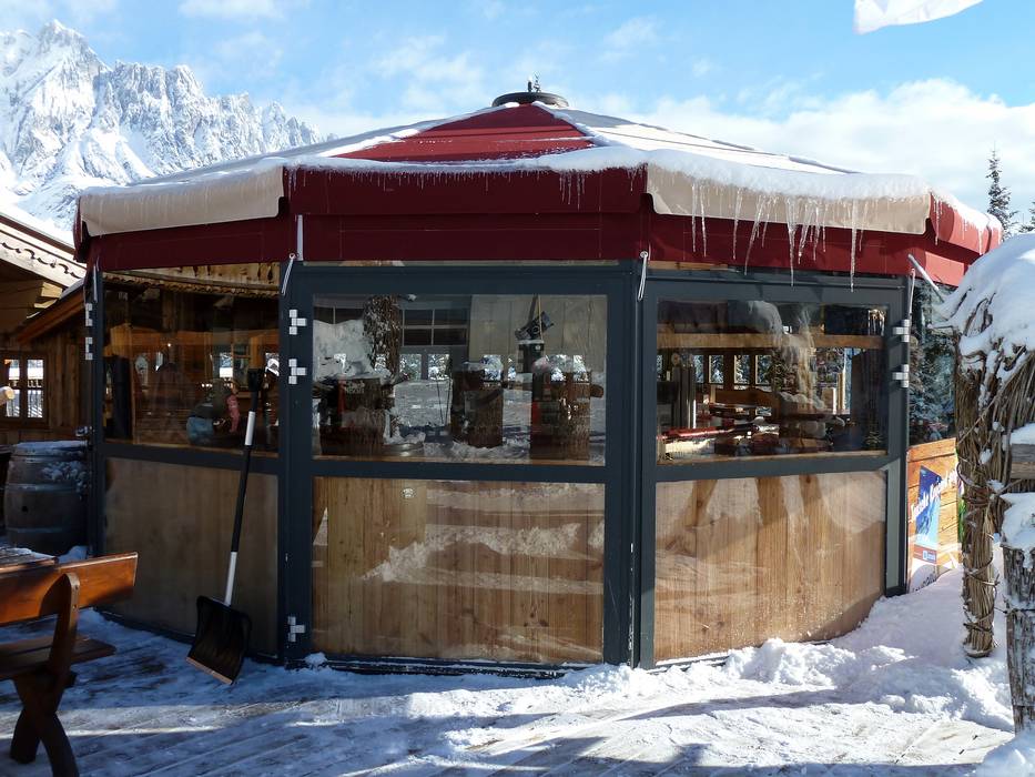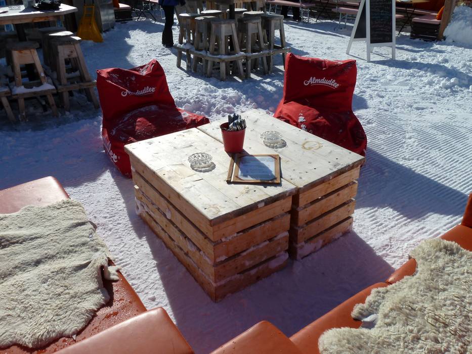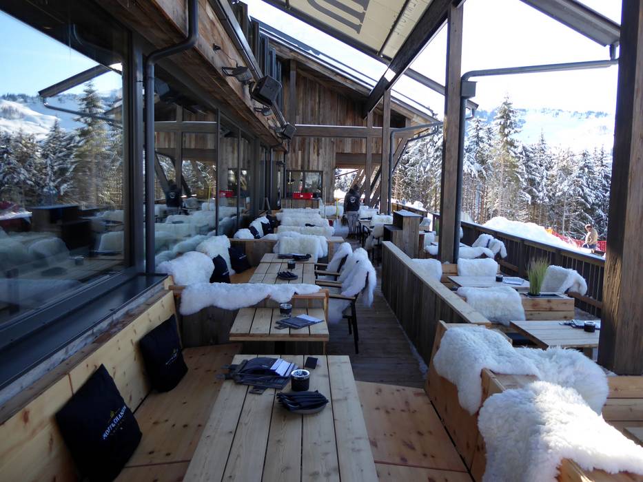 Zwei gemütliche, urige Hütten sind durch einen chilligen Bar- und Loungebereich miteinander verbunden. Darüber thront die große Panorama-Terrasse, welche den Gästen herrliche Bergblicke gewährt - Freiluftkino für den ganz großen Horizont.