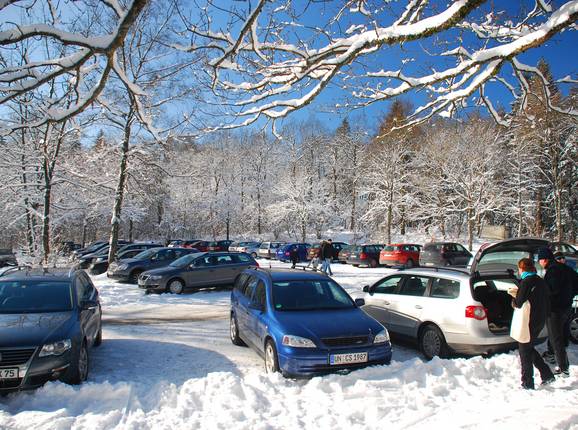 Parkplätze: meist ausreichend vorhanden, asphaltierter Platz, Kiesplatz, kostenfrei