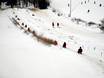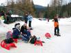 Für Familien gibt es knapp 14% Ermäßigung, allerdings nur auf die Tageskarte, die Skischule unterrichtet Kinder erst ab einem Alter von sechs Jahren und der kleine Übungsbereich hat keinen Lift, ist aber immerhin spärlich dekoriert. Positiv sind die extrem kurzen Wege, Skiverleih, Skischulbüro, Toiletten, Kasse – hier ist wirklich alles auf einem Fleck. Auch die Übersichtlichkeit des Skigebietes schätzen Familien, verloren geht hier niemand. Wer noch nicht Skifahren kann oder will, findet mit dem Rodelliften eine Alternative. Kinderbetreuung gibt es nicht, aber einen Wickelraum.