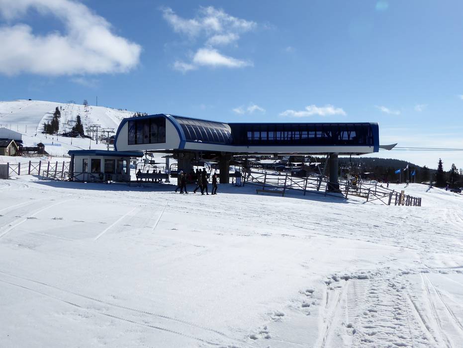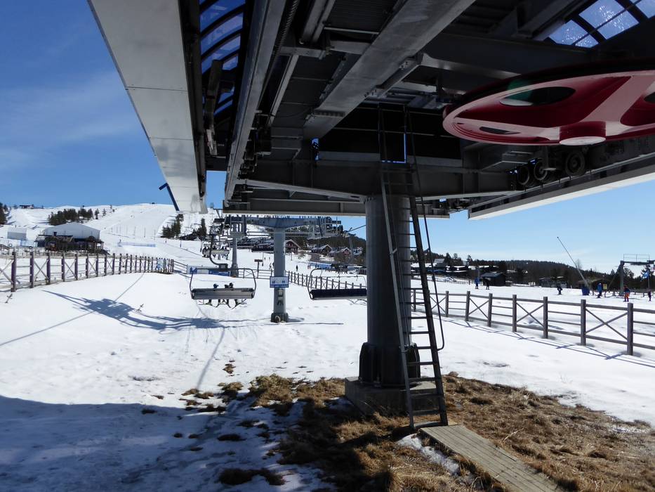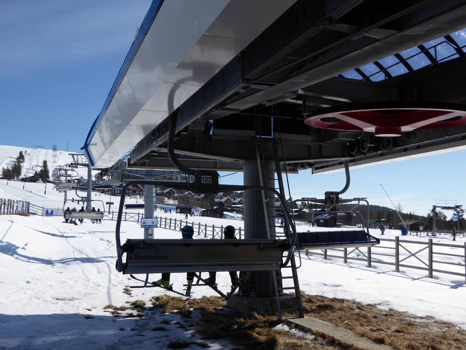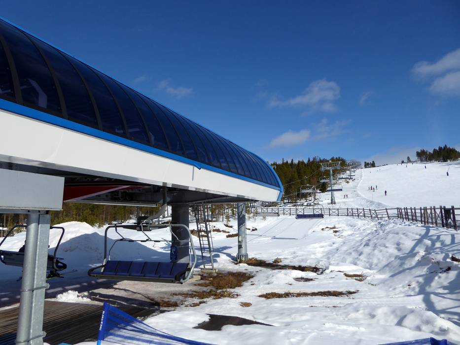 Die Sechsersesselbahn Väst 6:an hat eine Mittelstation mit Kurve. Man kann an der Mittelstation jedoch nur aussteigen.