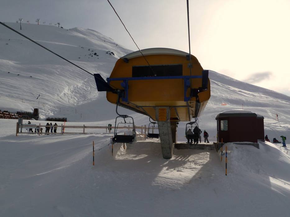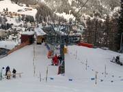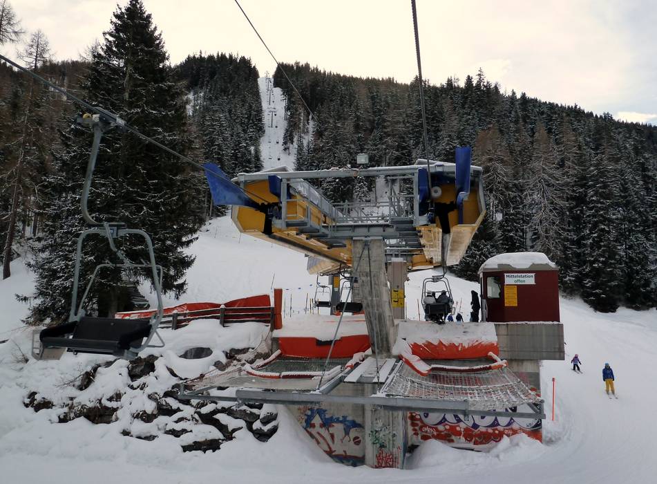 Die 2er-Sesselbahn Carjöl-Carjöler Rank-Fuxägufer hat eine Mittelstation mit Kurve.