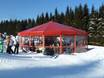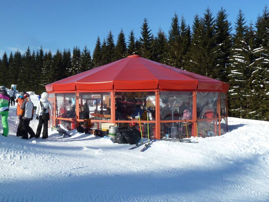 Kurz vor dem Parkplatz an der Talstation der Sesselbahn Dámska wartet eine Après-Schirm Bar auf die Gäste.