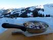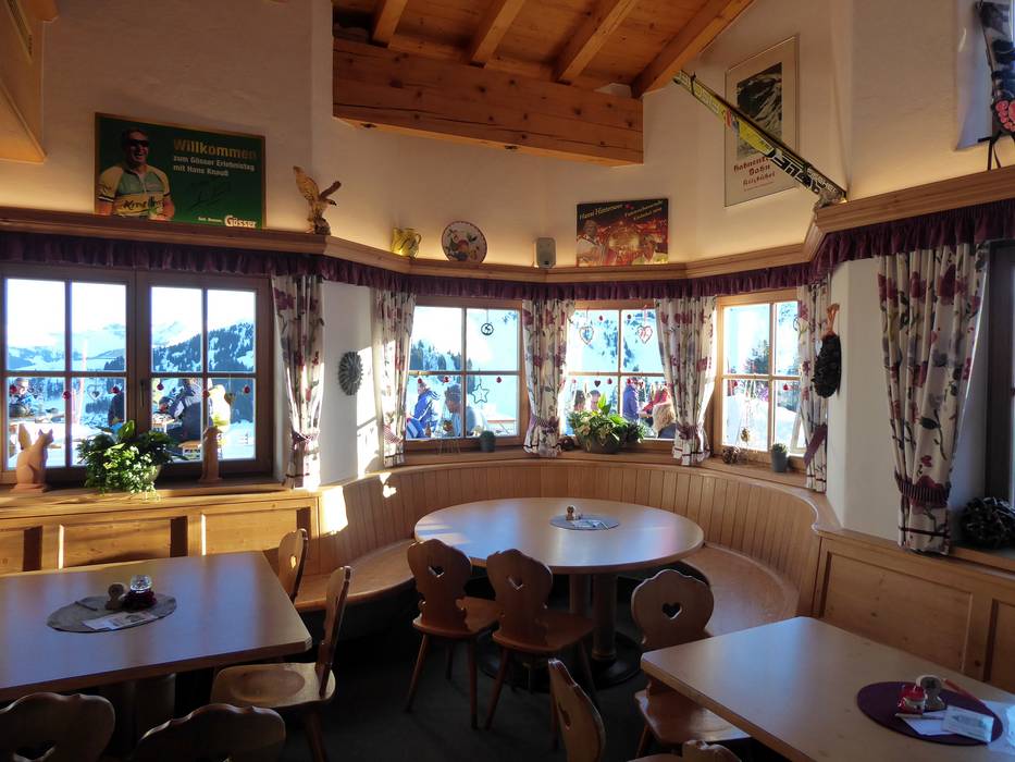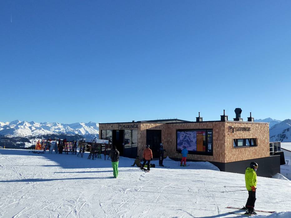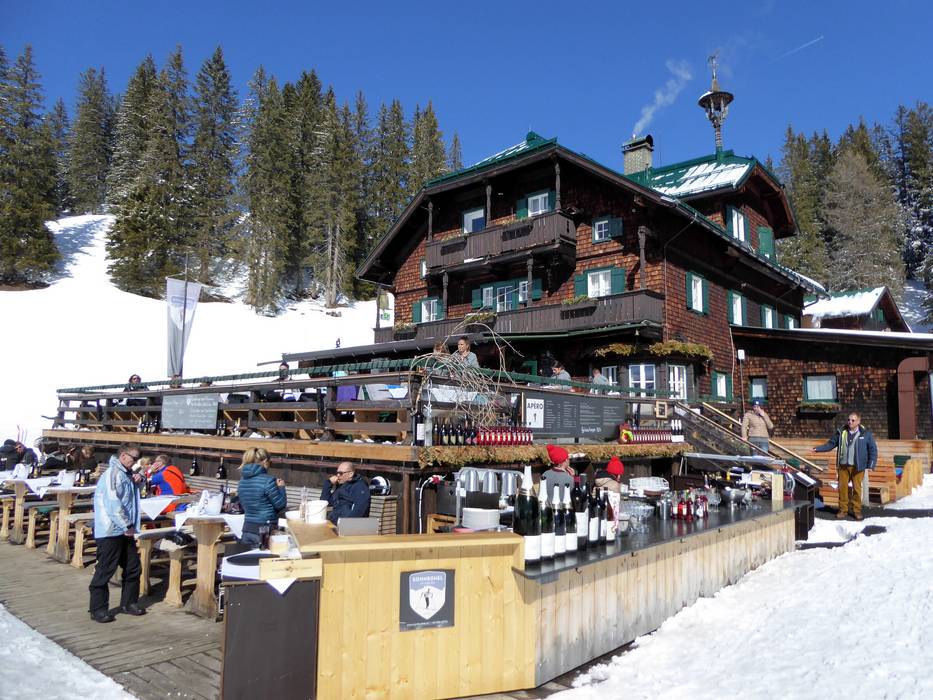 Die Aussicht von der Sonnenterrasse ist etwas ganz besonderes - so ein Panorama findet man so schnell nicht wieder. Die urige Berghütte mit den netten Stuben und gutem Essen lockt die Gäste aus dem ganzen Skigebiet an. Die Bar auf der Sonnenterrasse ist ein beliebter Treffpunkt.