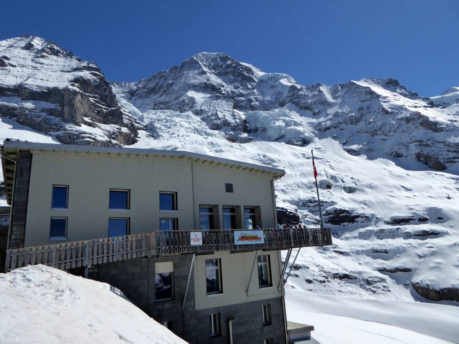 Die Jungfraubahn führt von der Kleinen Scheidegg durch Eiger und Mönch bis auf das Jungfraujoch mit der höchsten Eisenbahnstation Europas auf 3454 m (Top of Europe). Hier befindet sich das Sphinx-Observatorium auf 3571 m, das höchste und markanteste Gebäude auf dem Jungfraujoch. Von hier oben hat man einen herrlichen Ausblick über den Aletschgletscher und das Berner Oberland. Bei guter Fernsicht reicht die Sicht sogar bis zu den Vogesen und bis zum Schwarzwald. Vom Jungfraujoch starten keine Pisten und man nimmt wieder die Zahnradbahn ins Tal.